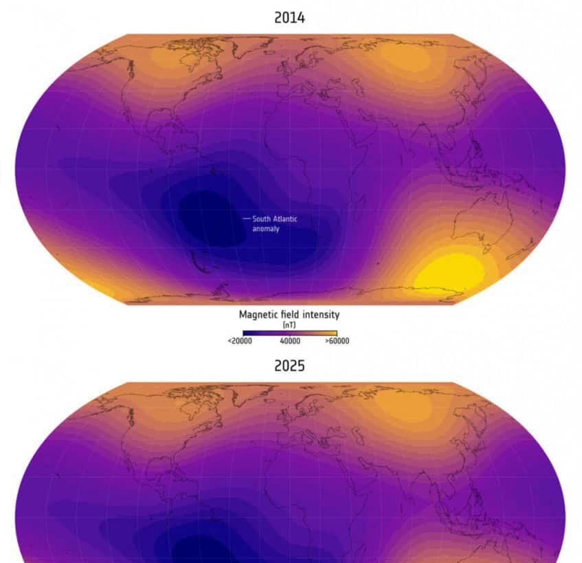 Segundo os autores, parte do fluxo magnético sob a SAA inverte a orientação esperada, retornando ao núcleo em vez de emergir dele. Esse comportamento sugere processos profundos que alteram o campo em poucos anos, algo reforçado pela identificação de um leve enfraquecimento sobre o Canadá e de um fortalecimento sobre a Sibéria.