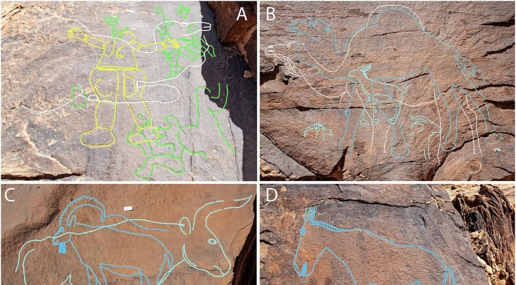 Coordenada pela arqueóloga Maria Guagnin, do Instituto Max Planck de Geoantropologia, a equipe investigou três maciços rochosos até então inexplorados — Jebel Arnaan, Jebel Mleiha e Jebel Misma. Em paredões que ultrapassam 30 m de altura, pesquisadores localizaram gravuras de cabras, camelos e símbolos geométricos coloridos em verde, amarelo, branco e azul. Alguns painéis estavam entre 34 e 39 m do solo, o que indica escalada e planejamento complexo por parte dos artistas pré-históricos.