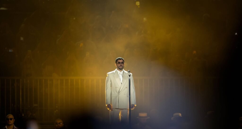A chegada do porto-riquenho a São Paulo ocorreu na noite de sexta-feira, 20 de outubro, diante de dezenas de milhares de espectadores que ocuparam todos os setores do estádio localizado no bairro da Barra Funda. O cantor — vencedor do último Grammy e recordista de streams — volta ao mesmo palco no sábado, 21, mas já na primeira data deixou claro por que lidera a música pop global. Trajando terno e gravata brancos, ele abriu o espetáculo com “La Mudanza”, faixa sustentada por uma base de salsa rígida que dialoga com suas raízes de rapper, e seguiu mesclando sucessos recentes a referências tradicionais de Porto Rico.