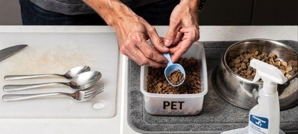Outra ameaça frequente é a contaminação cruzada, que ocorre quando utensílios destinados à ração entram em contato com alimentos humanos ou superfícies de preparo sem higienização. O guia sugere reservar colheres, conchas e medidores exclusivamente para o pet, evitando o uso de facas ou tábuas da família na manipulação de comida animal.