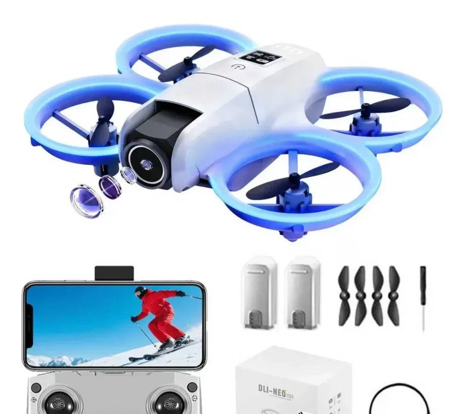 O primeiro drone da lista é voltado a usuários que valorizam praticidade e tempo de voo ampliado. Conhecido como Drone Dli Neo Mini com Câmera Full HD, ele traz câmera em 1080p, possibilitando fotografias e vídeos em qualidade adequada para compartilhamento nas redes sociais. O modelo emprega conexão Wi-Fi para transmitir imagens em tempo real ao smartphone, recurso que ajuda a ajustar enquadramento e controlar o voo sem necessidade de acessórios adicionais.