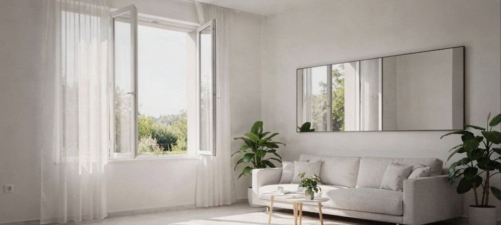 Com o avanço do dia, a temperatura externa tende a subir e, junto a ela, a radiação que atravessa aberturas envidraçadas. À tarde, posicionar espelhos e cores claras nas zonas de sombra continua eficaz para espalhar a luz remanescente sem aumentar o calor. Se a sala dispuser de ventilação cruzada, abrir janelas opostas favorece a troca de ar e complementa o trabalho das superfícies reflexivas, auxiliando na redução gradual da temperatura.