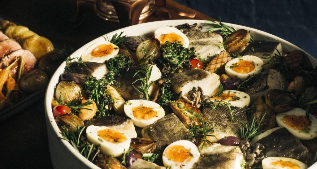 Na Ghee Banqueteria, o cardápio inicia com petiscos como canapés de roquefort e bolinhos de siri (12 unidades, R$ 144). Como entrada, o salpicão de bacalhau de 500 g sai por R$ 220. No rol de principais, há lombo de bacalhau ao forno (1,2 kg, R$ 580), brandade com mandioquinha palha (1,5 kg, R$ 490) e torta do mesmo pescado (R$ 480). Massas, acompanhamentos e doces completam o catálogo. Pedidos devem entrar até 30 de março, com entrega ou retirada na Aclimação mediante agendamento.