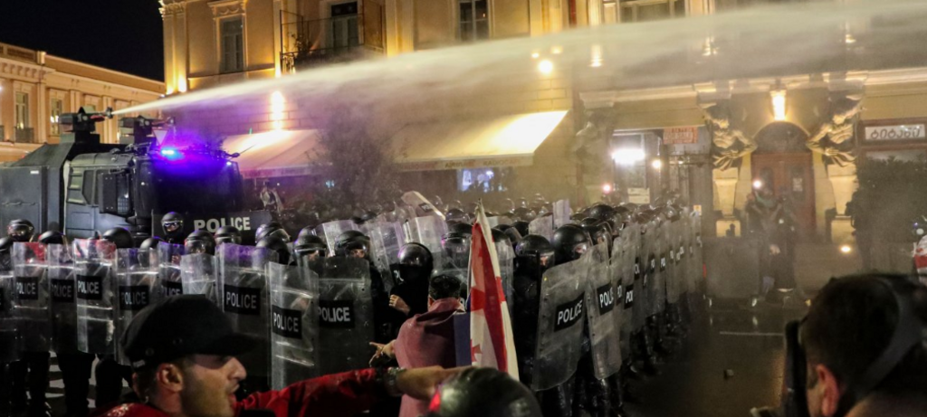 Protesto em Tbilisi ganhou novos contornos neste sábado (30) quando manifestantes tentaram entrar no palácio presidencial da capital da Geórgia, obrigando a polícia a usar canhões de água e spray de pimenta para dispersar a multidão.